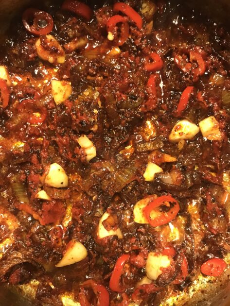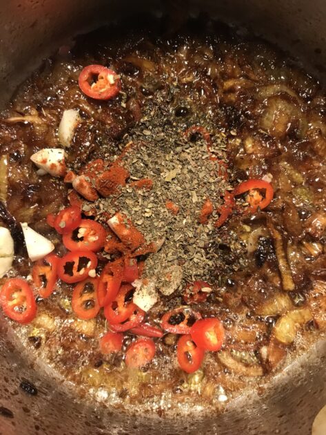 Hak chili og hvidløg groft og tilføj dem til løgene sammen med tørret basilikum og røget paprika. Steg kort og tilføj tomatpuré. Lad det stege med lidt og kom så de flåede tomater og grøntsagsboullion ved.