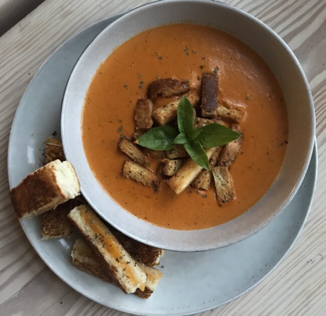 Servér suppen med croutonerne, evt. frisk basilikum på toppen og grilled cheese sticks på siden.