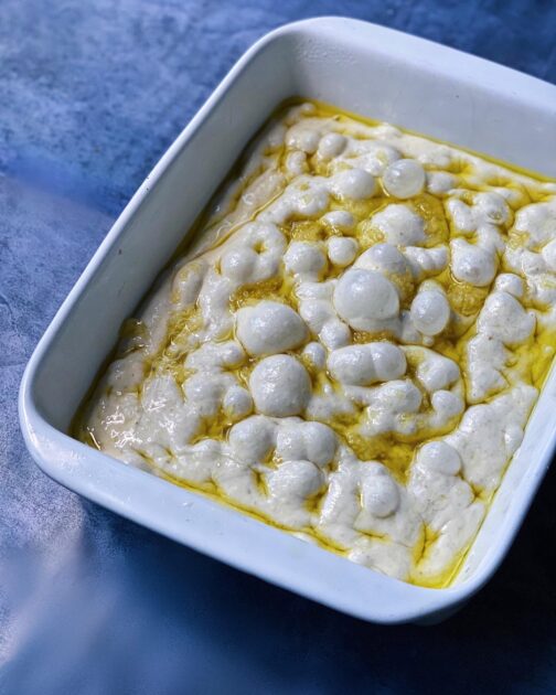 Bland mel og vand til focaccia dejen og lad det hvile mens du venter på din surdej er klar. Det kaldes en autolyse og gør at gluten nettet får lov at udvikle sig. Det gør også at du ikke behøver ælte dejen.