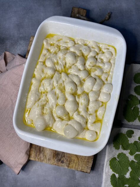 Hæld lidt af hvidløgsolien på toppen og tag lidt olie på fingrene. Lav huller i dejen med fingrene, så der dannes luftbobler på toppen.