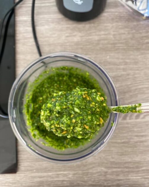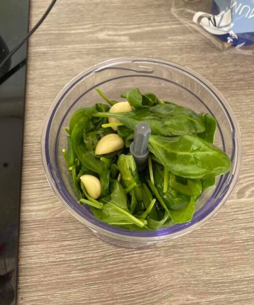 - Kør basilikum, spinat, hvidløg, olie og salt til helt finthakket.